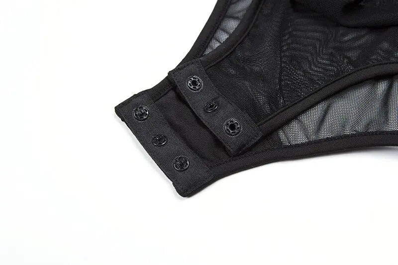 Crafted from high-quality polyester and spandex, this bodysuit offers both comfort and durability, ensuring that it moves seamlessly with you, no matter the setting. The transparent mesh and hollow-out accents highlight your curves, creating a sophisticated yet sexy silhouette that's sure to turn heads.