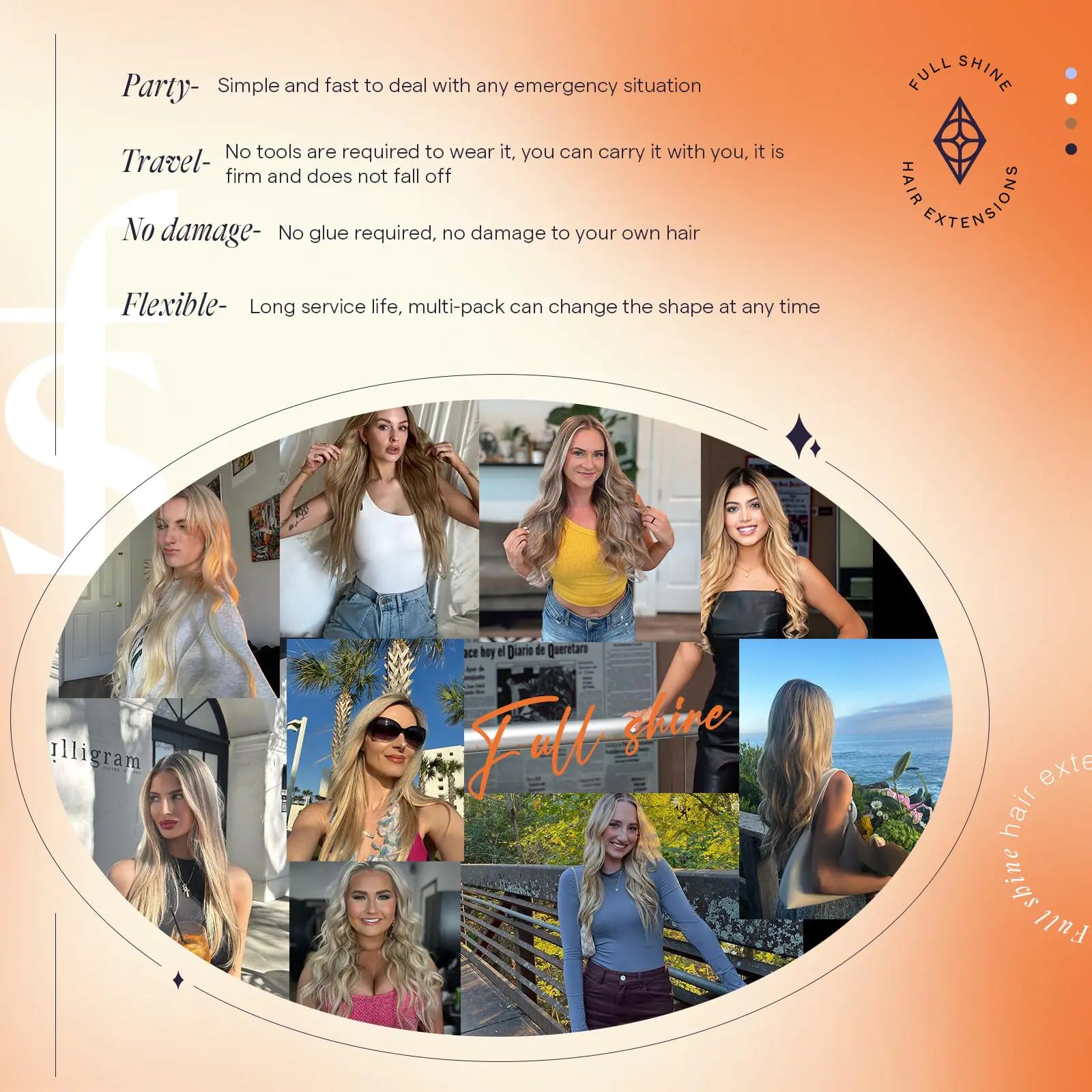 Full Shine Clip-in Hair Extensions: Elevate Your Hair Game with Real Human Hair. Are you looking to transform your hairstyle effortlessly? Look no further than Full Shine, we are synonymous with quality and innovation in the world of hair extensions. Our clip-in hair extensions are made from the finest real human hair, ensuring a natural and seamless blend with your own locks. With Full Shine, you can achieve the hair of your dreams in an instant. Quantity: 7 Pcs/Set, Usually Can Make A Full Head For A Normal Size Hair Extensions Clip In Human Hair Life: 12-24 Weeks(Depending On Your Care And Usage). Real Human Hair: We believe in the authenticity of beauty, which is why all our clip-in hair extensions are crafted from real human hair. This ensures a flawless blend with your natural hair, offering a realistic appearance that is virtually indistinguishable. With Full Shine, you can enjoy the freedom to style, curl, and dye your extensions just like you would with your own hair. Customized:Full Shine understands that everyone has different hair needs,you can tell us the hair you want. How To Use Clip In Hair Extensions: 1. Make Your Own Hair Separate. Open The Clips And Wear On Your Hair. 2. Close The Clips And Check If You Wear Firm. 3. Repeat The First To Second Steps To Wear 2-3 Pieces. 4. Repeat The First To Third Steps To Wear On The Other Side Of The Head. 5. After Wearing All Hair Pieces, Put Your Hair Down And Comb Neatly. Washing Method: Exact Colors That Are Pictured Might Not Be The Same Because Of Different Monitors Being Used And Cameras Order today and get ready to turn heads wherever you go. Choose Full Shine today and experience the difference that quality can make.