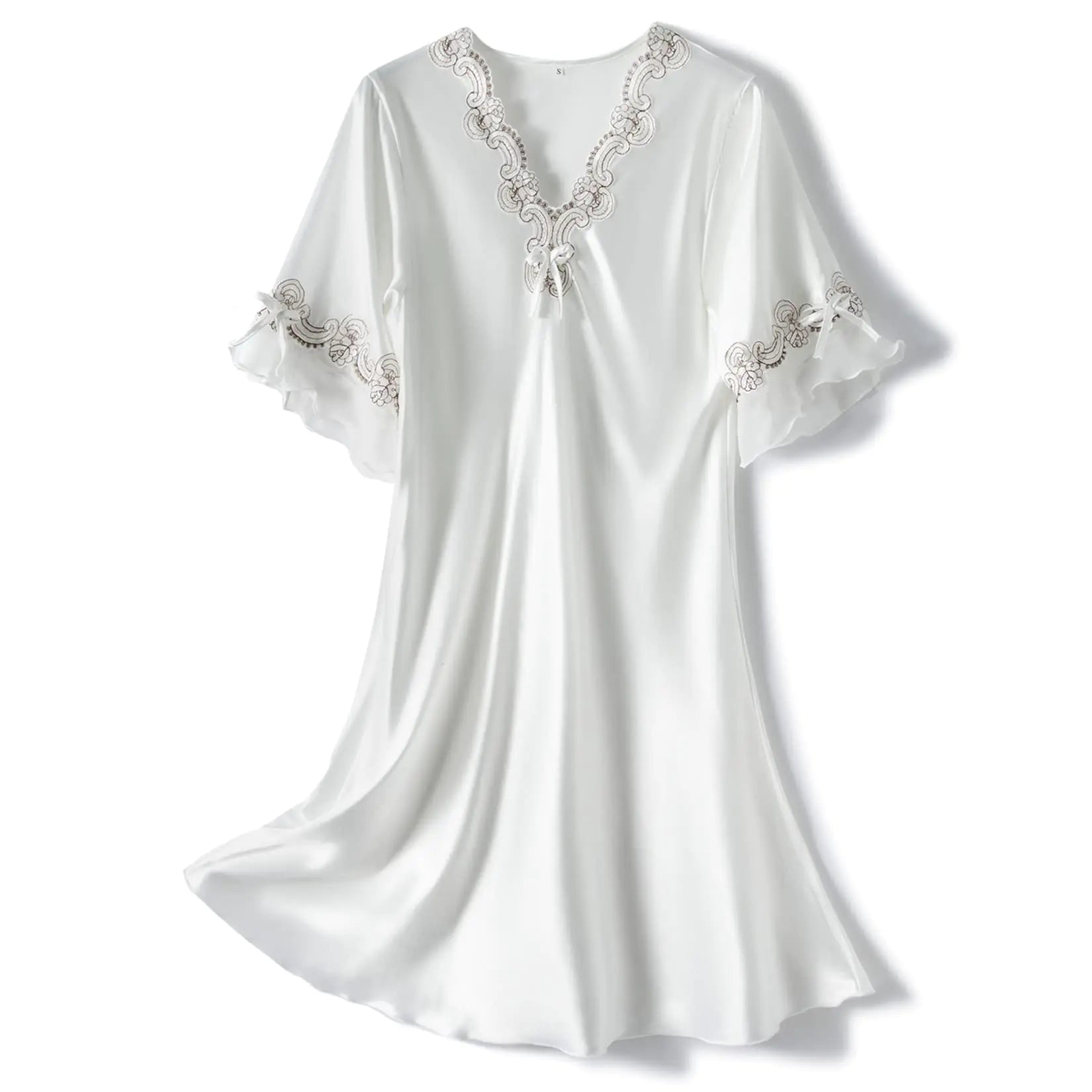 Lus Chic Womens Satin Nightgown Summer Luxury Soft Lace Short Sleeve V Neck Sleep Shirt Sleepwear White XL