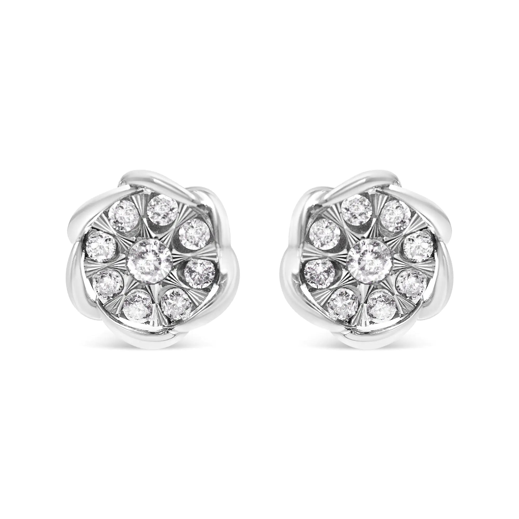 Elevate your everyday look with these modern floral 1/2 c.t. diamond studs. These earrings are each set with 9 round-cut diamonds in a spaced-out, floral design. The central stone is larger than the stones flanking it, and the flower design is enveloped by 10k white gold wrapped around in a crisscross latice design. These studs come with a push-back mechanism for a safe and secure fit on your ears! Instantly dress up any outfit of yours with these intricately designed earrings.