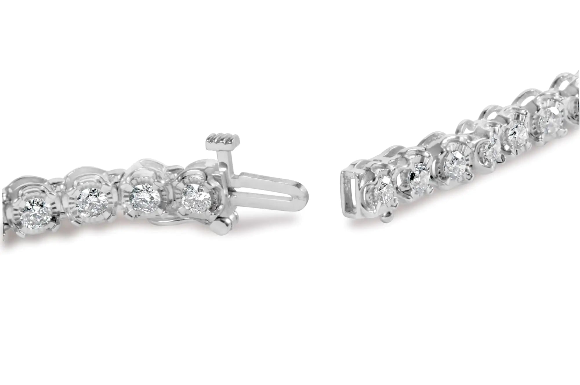 Indulge in the ultimate luxury with this stunning 10K white gold tennis bracelet. Adorned with 3.00 cttw of natural diamonds, this piece is an absolute showstopper. The miracle set bezel design creates an illusion of larger diamonds, making this bracelet a true statement piece. With 38 round diamonds in H-I color and I2-I3 clarity, this bracelet is sure to catch the eye of anyone who sees it. The link style design ensures a comfortable fit and the box clasp ensures it stays securely on your wrist. Perfect for any special occasion or to elevate your everyday look. Don't miss out on this exquisite piece of jewelry.
