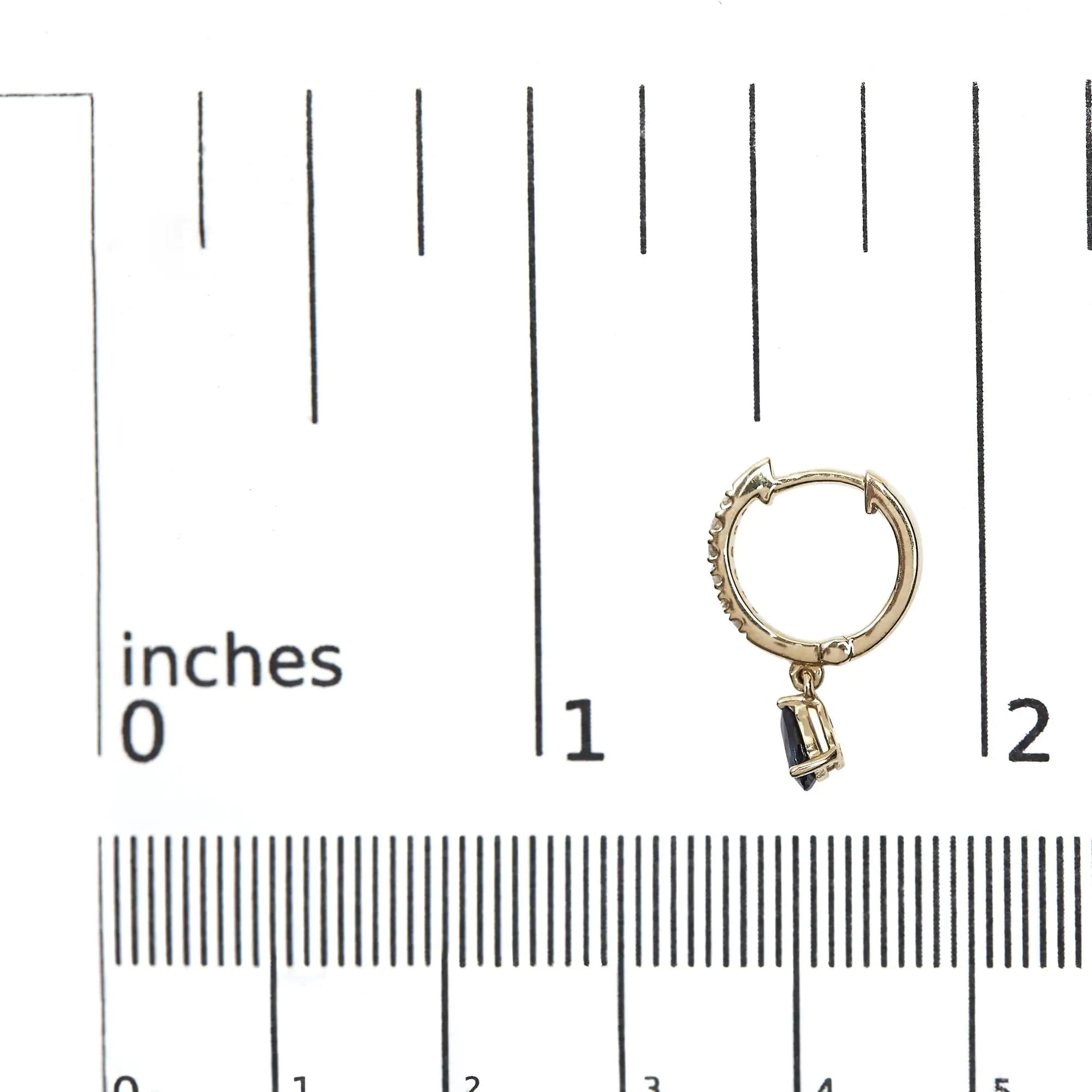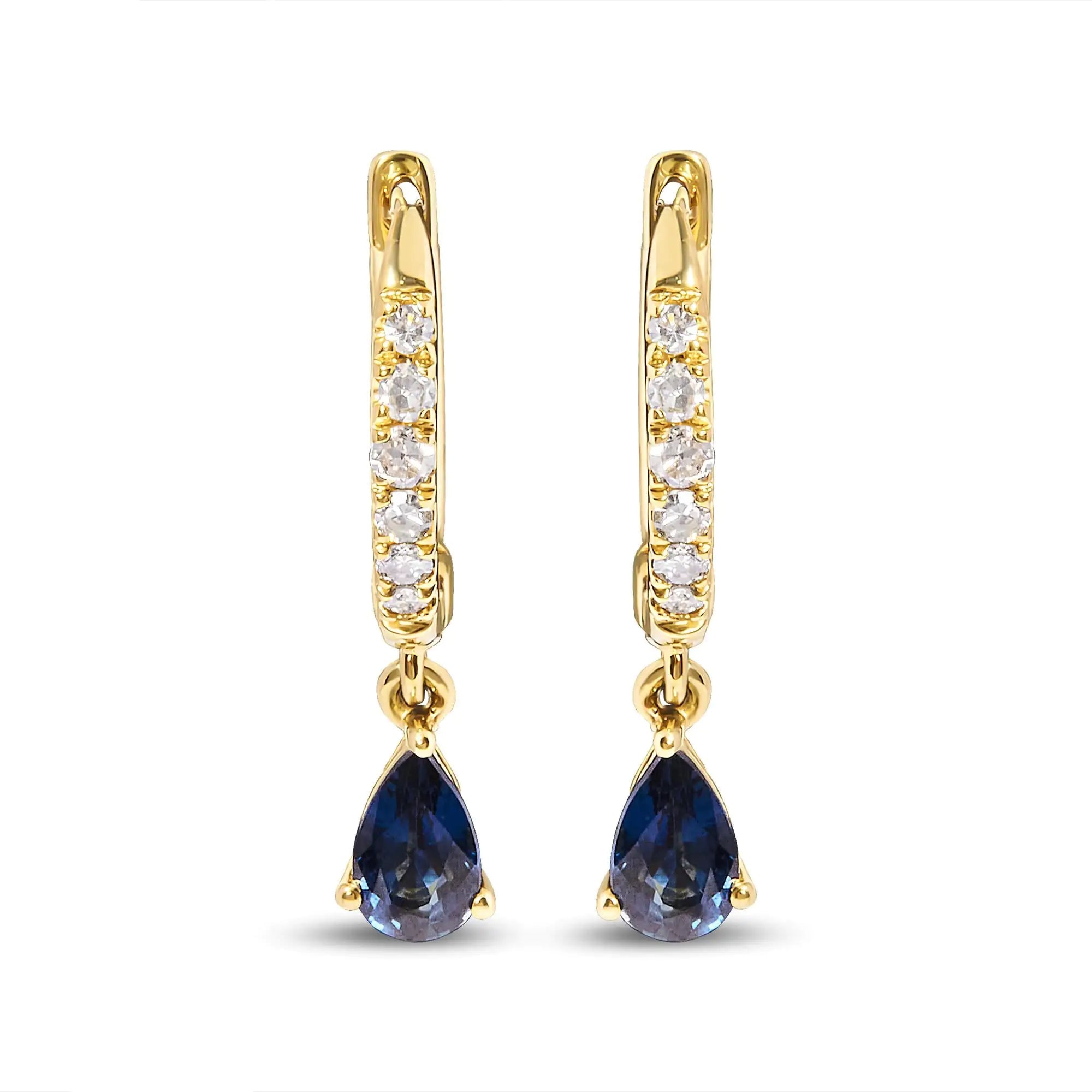 Indulge in the captivating allure of these 10K Yellow Gold Pear Blue Sapphire and Diamond Drop and Dangle Huggy Hoop Earrings. Crafted with meticulous attention to detail, these earrings boast a stunning design that effortlessly combines elegance and sophistication. Adorned with 12 dazzling round diamonds, totaling 1/10 cttw, these earrings add a touch of brilliance to any ensemble. The H-I color of the diamonds ensures a radiant sparkle, while the I1-I2 clarity guarantees a mesmerizing clarity. The sapphire gemstones, with their rich blue hue, exude an aura of timeless beauty. With a pear shape and a size of 3 x 5 MM, these gemstones are securely set in a 3-prong setting, enhancing their natural allure. The lever-backs provide a secure and comfortable fit, making them perfect for everyday wear. Whether you're attending a special occasion or simply want to elevate your everyday style, these earrings are a must-have addition to your jewelry collection.