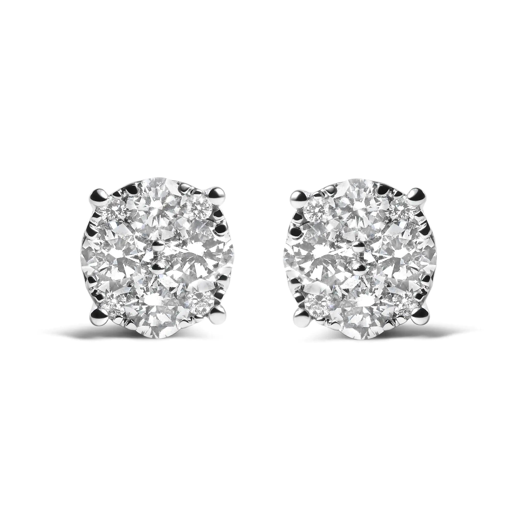 These stunning stud earrings are the perfect addition to any woman's jewelry collection. Made with 14K white gold and featuring a blend of lab grown and natural diamonds, these earrings exude elegance and sophistication. The round diamond shape and prong setting add a touch of glamour, while the push back earring finding ensures a secure and comfortable fit. With a total diamond weight of 2 cttws and a diamond count of 8 lab grown and 8 natural diamonds, these earrings are sure to catch the eye of anyone who sees them. The diamonds are also of high quality, with a color range of G-H and clarity of VS1-VS2. Whether you're dressing up for a special occasion or just adding some sparkle to your everyday look, these diamond cluster stud earrings are sure to impress.