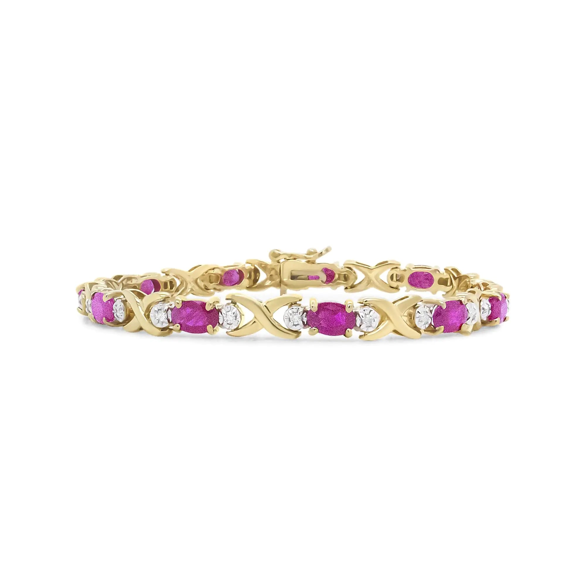 This vivacious red ruby and diamond Tennis Bracelet will glitter on her wrist. This beautiful bracelet crafted in lustrous 14 karat yellow gold showcases 22 dazzling prong set round cut diamonds and 11 alluring oval cut red rubies that alternate between high-polish gold 'X' links . Fastens with a secure clasp. Total diamond weight is 1/4 Ctw and each oval cut sapphires measures 6x4mm. Rubies may be treated for deeper color saturation.