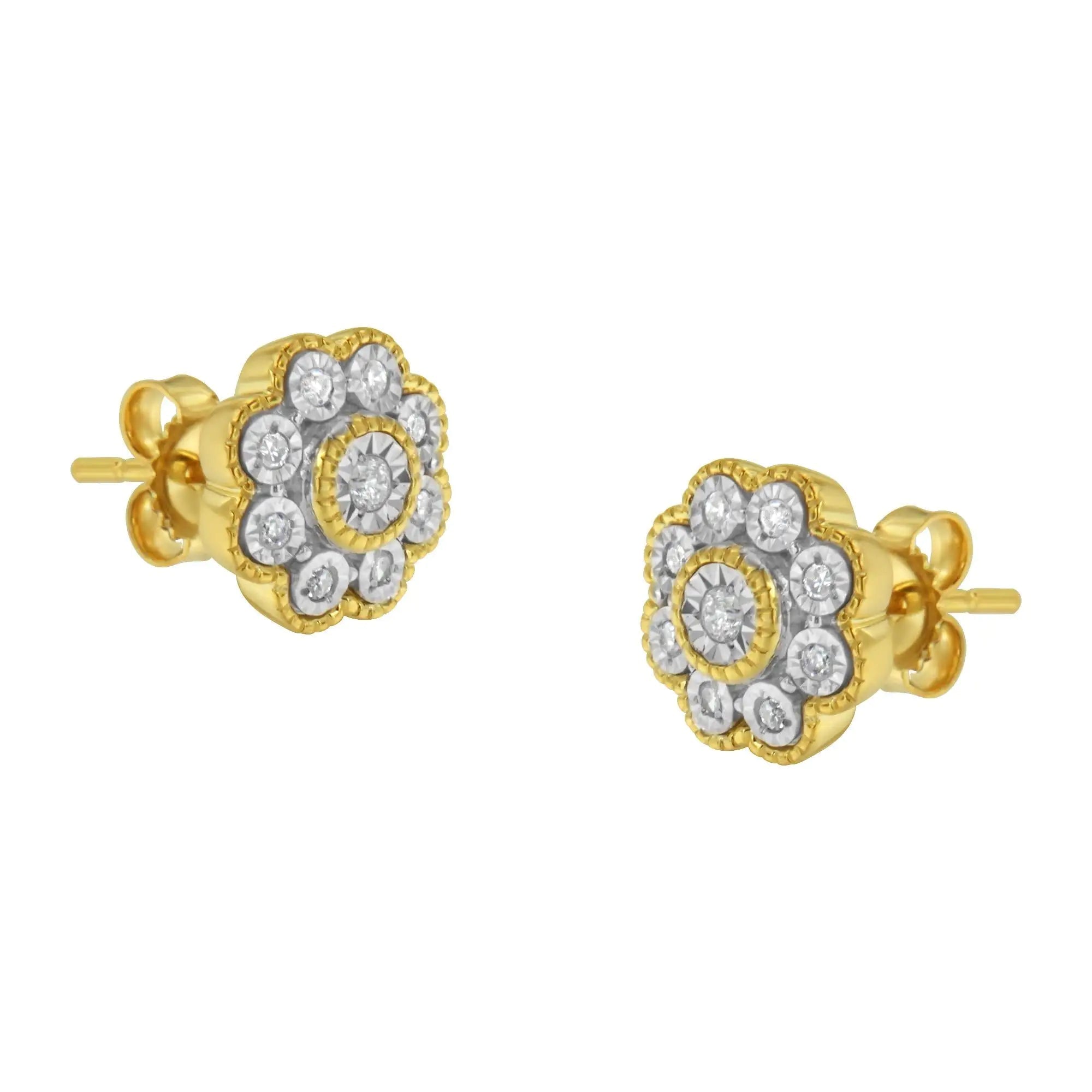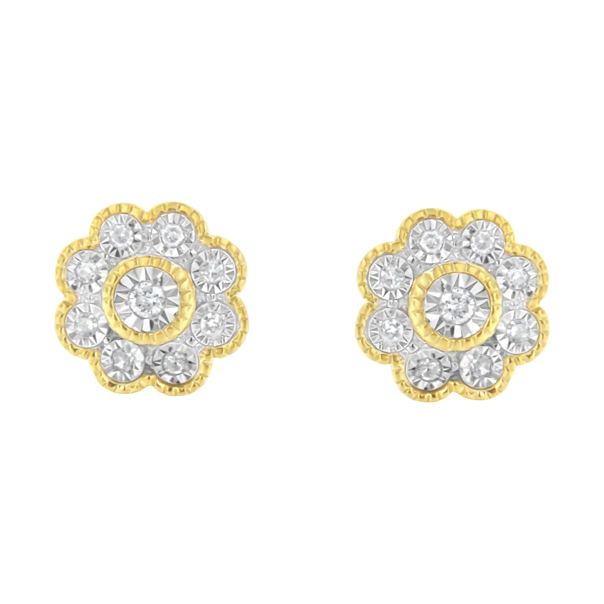 Beautiful and elegant, these 14k yellow gold plated sterling silver stud earrings feature a nature inspired design. Miracle set diamonds are arranged to create a floral design. A yellow gold beaded ribbon wraps around the central diamond as well as the outside of the flower petals. A push back mechanism keeps the earrings secure and you worry free.