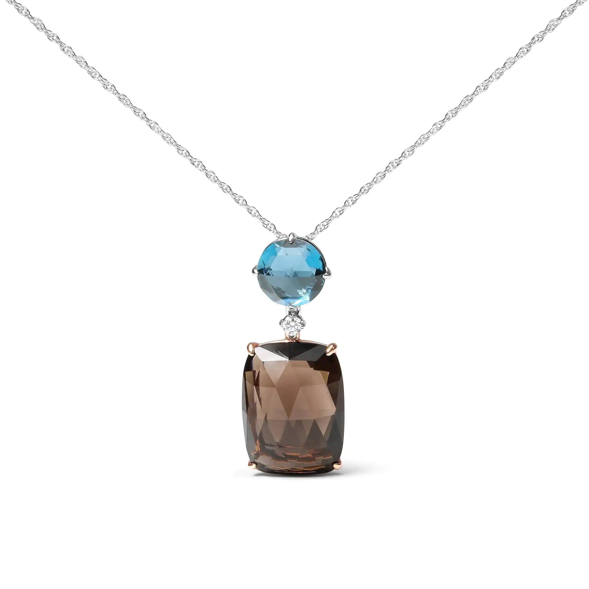 Celebrate any occasion with the beauty and allure of natural gemstones! This lovely pendant necklace is crafted from genuine 18k rose and white gold, a metal that will stay tarnish-free for years to come. The bail is prong-set with a 9x9mm round heat-treated London blue topaz under which is suspended a solitaire round diamond accent stone in a prong setting with an approximate G-H Color and SI1-SI2 Clarity. The icing on the cake that is this stunning necklace is the 20x15mm cushion-cut heat treated smoky quartz gemstone in a 4-prong setting. This elegant pendant suspends gracefully from an 18" contemporary rope chain that secures with a spring ring clasp.