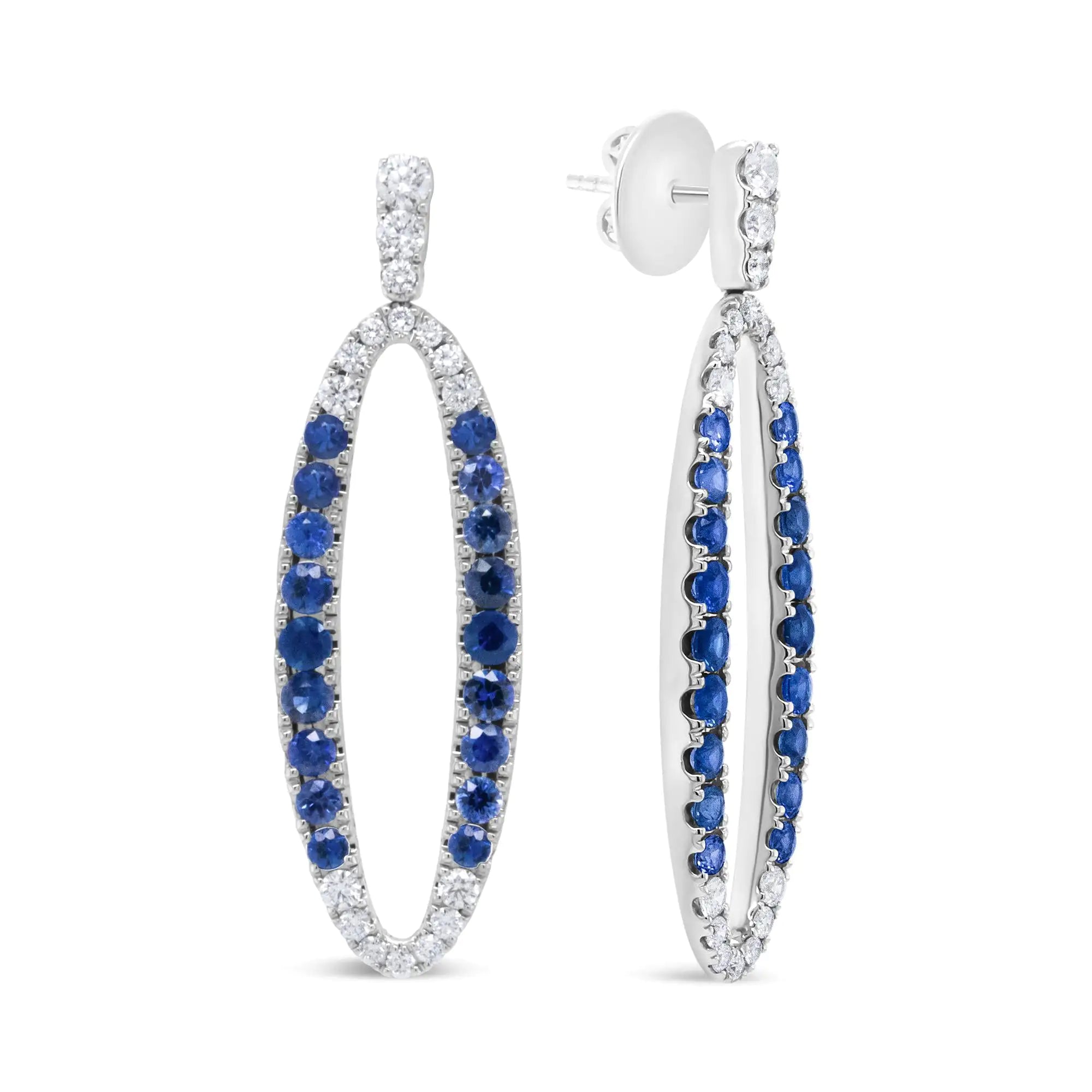 A brilliant sparkle shines supreme from these glorious 18k white gold dangle earrings. An openwork oval hoop silhouette gives this pair a chic, contemporary vibe. Round white diamonds run along the bail and dangle of the earrings, secured in prong settings. Cutting a path through the center of the dangle is the rich hue of 2.5mm round heat-treated light blue natural sapphires and 3mm round dark blue sapphires in a graduated design that stems from the center gem, growing smaller as they fan out. The diamonds showcased in these earrings total 1.11 cttw with an approximate F-G Color and VS1-VS2 Clarity. Push back findings keep these pierced earrings safe and secure on the ear.