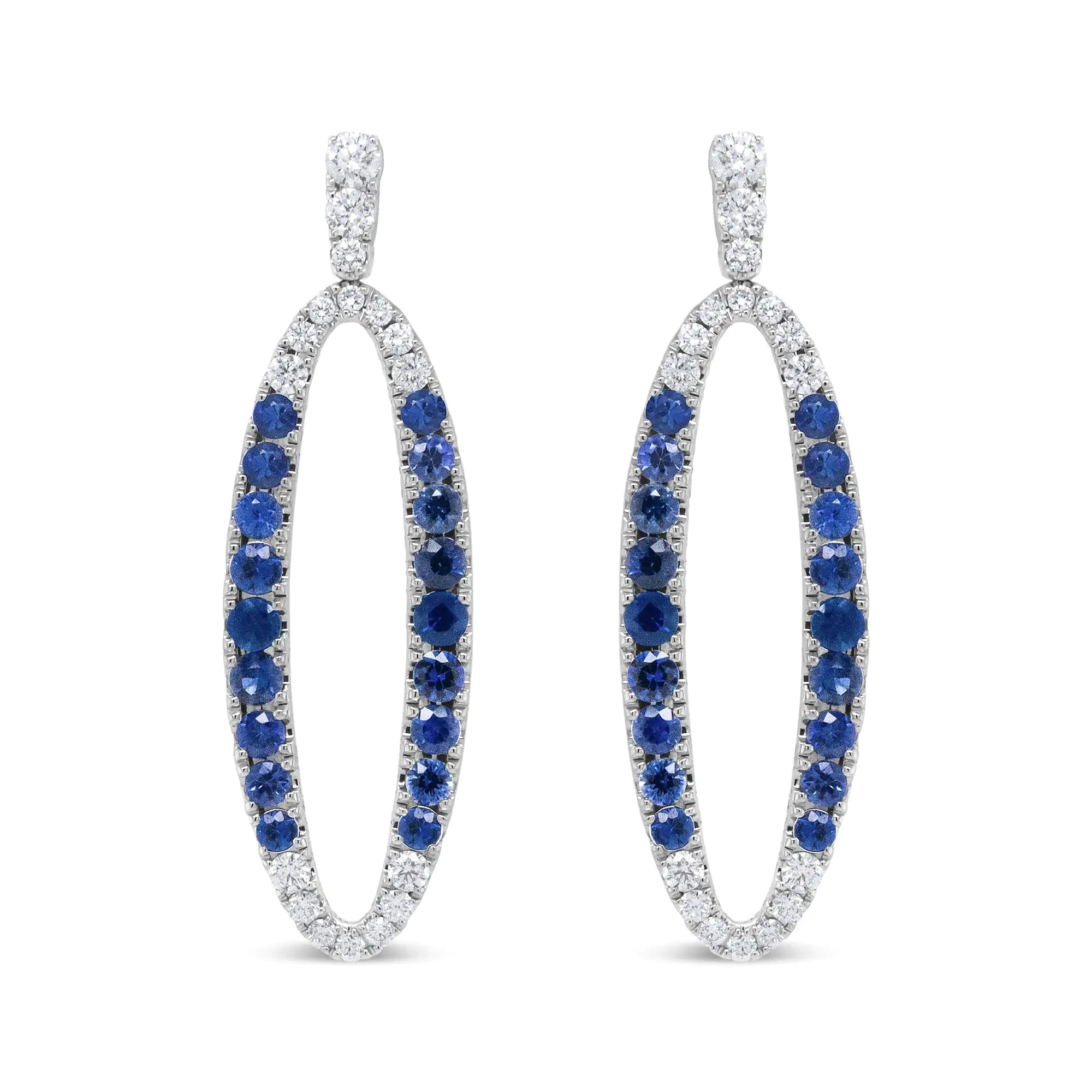 A brilliant sparkle shines supreme from these glorious 18k white gold dangle earrings. An openwork oval hoop silhouette gives this pair a chic, contemporary vibe. Round white diamonds run along the bail and dangle of the earrings, secured in prong settings. Cutting a path through the center of the dangle is the rich hue of 2.5mm round heat-treated light blue natural sapphires and 3mm round dark blue sapphires in a graduated design that stems from the center gem, growing smaller as they fan out. The diamonds showcased in these earrings total 1.11 cttw with an approximate F-G Color and VS1-VS2 Clarity. Push back findings keep these pierced earrings safe and secure on the ear.