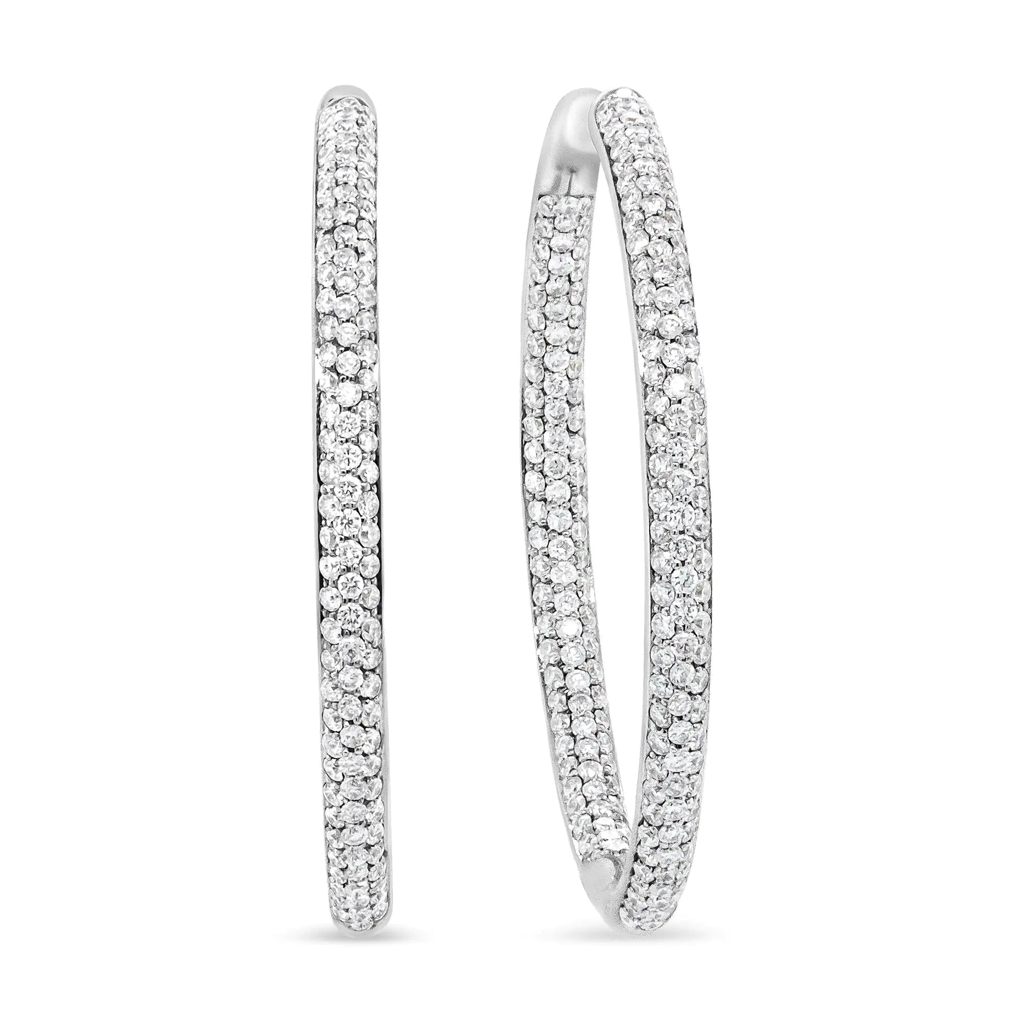 A glamorous take on a classic design, these breathtaking diamond hoops are crafted in luxurious 18k white gold that will sparkle on your earrings. The gold reflects beautifully on the stunning VS1-VS2 clarity diamonds in a round-cut design. The diamonds shine on the outer and inner sides of these earrings, giving it a double shine effect. With an impressive total carat weight of 2.00 cttw, these hoops are an investment you will be happy to make.