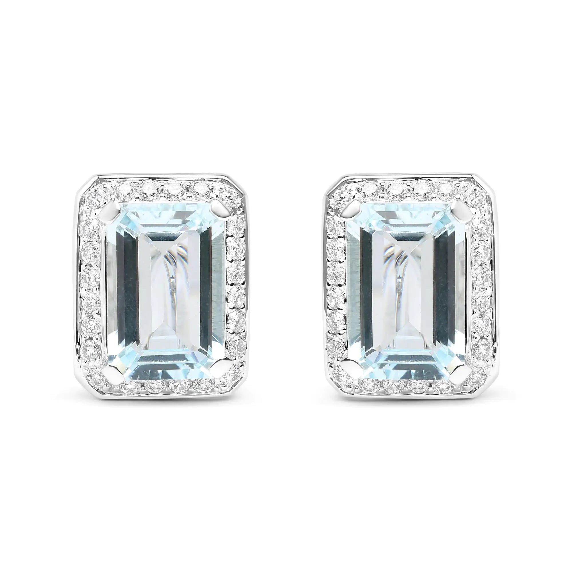Budding with grace and elegance, these stud earrings bring a feminine energy crafted from genuine 18k white gold with natural gemstones and diamonds in a regal motif. At the center of each earring is a stately 13x9mm emerald-cut, heat-treated blue aquamarine gemstone in a 4-prong setting. A sparkling halo of round, prong-set diamonds frames this centerpiece with a total 3/4 cttw and an approximate G-H Color and SI1-SI2 Clarity. Omega findings keep these pierced earrings safe and secure on your ears for comfortable, worry-free wear all day long.