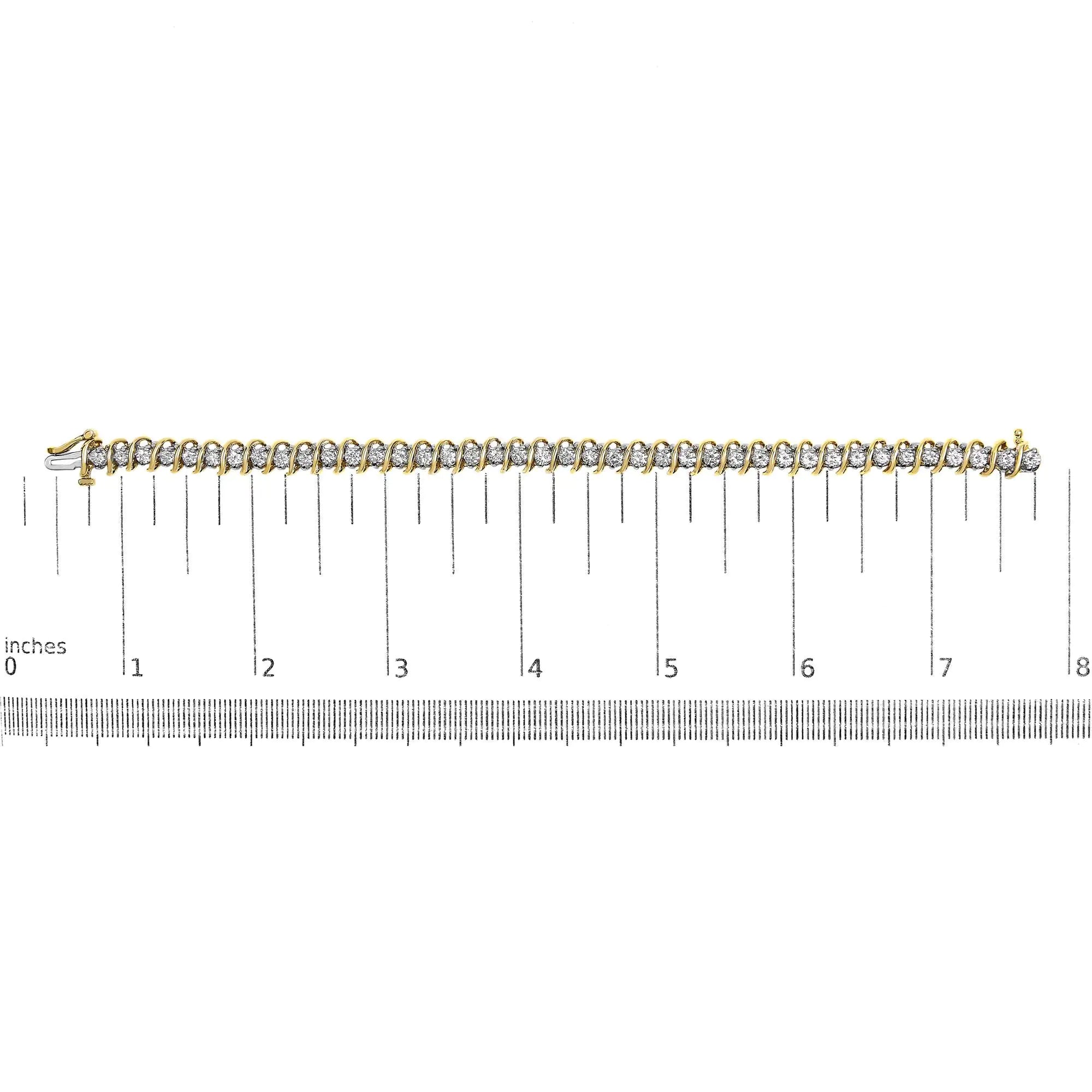 Imagine adorning your wrist with a symphony of elegance and brilliance. This exquisite tennis bracelet, fashioned from lustrous 18K yellow gold, weaves a tale of timeless sophistication and artistry. Each 2-prong set meticulously selected round-cut diamond is a natural marvel, with I-J color and SI1-SI2 clarity, reflecting light in a dazzling array of sparkles. The 7-inch bracelet flows seamlessly, its S-link design a testament to unparalleled craftsmanship and attention to detail. As the diamonds encircle your wrist, totaling 4.0 carats, they create an unbroken line of luminosity, captivating the eye and enchanting the heart. Designed with a secure clasp, this piece not only ensures comfort and ease of wear but also speaks to the wearer's sense of security and style.