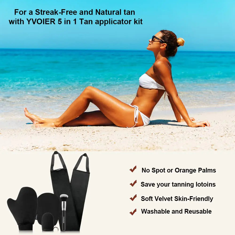Yvoier Self Tanning Mitt Kit borns for real Self Tanning! Our self tanning mitt applicator kit is included: 1 x Thumb tanning mitt, 1 x Mini tanning glove, 1 x Back Applicator, 1 x Exfoliate Mitt, 1 x Tanning Brush What our self tanner mitt can offer you? 1, Our tanning mitts self tanner kit can ensure you use the suitable tanning mitt according to different needs. The thumb sunless tanner mitt, designed with a thumb hole, have great control, can help you apply the lotions evenly on all your body part . The back applicator can reach to the back area that the hands are hard to reach. The mini tanning glove for self tan and tanning brush are perfect for the detail areas like the face and fingers. The exfoliate mitt performs well in removing dead skin, which can help the tanning product applied absorbed quicker more smoothly. 2, Premium velvet material makes our self tanner glove super soft, and there is an elastic cuff around the wrist, easy to take it on or off, and doesn’t slip off or rotate while using. 3, Good fabric material makes our self tan mit go on really smooth and streak-free while applying. 4, Our self tanner applicator are easy to clean,you can hand wash in warm water, or machine wash and hang dry. Aslo, washing will not lose its softness,durable material allows you to use it again and again. 5, The sunless tanner mitt use for a wide range of applications, it can be used together with other brands of lotion, cream, mousses, oil.